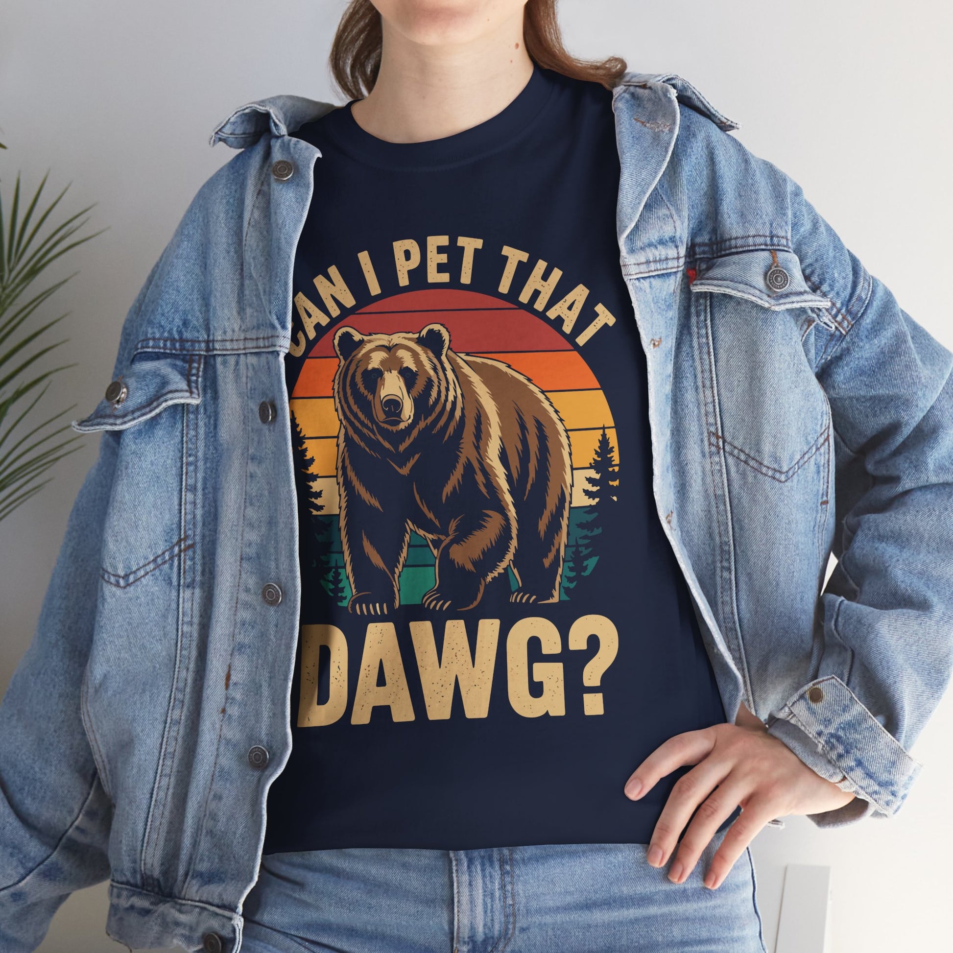 Bold Meme Graphic: Features a bear with a dog-like twist and the iconic “Can I Pet That Dawg?” phrase—perfect for meme fans and animal lovers alike.