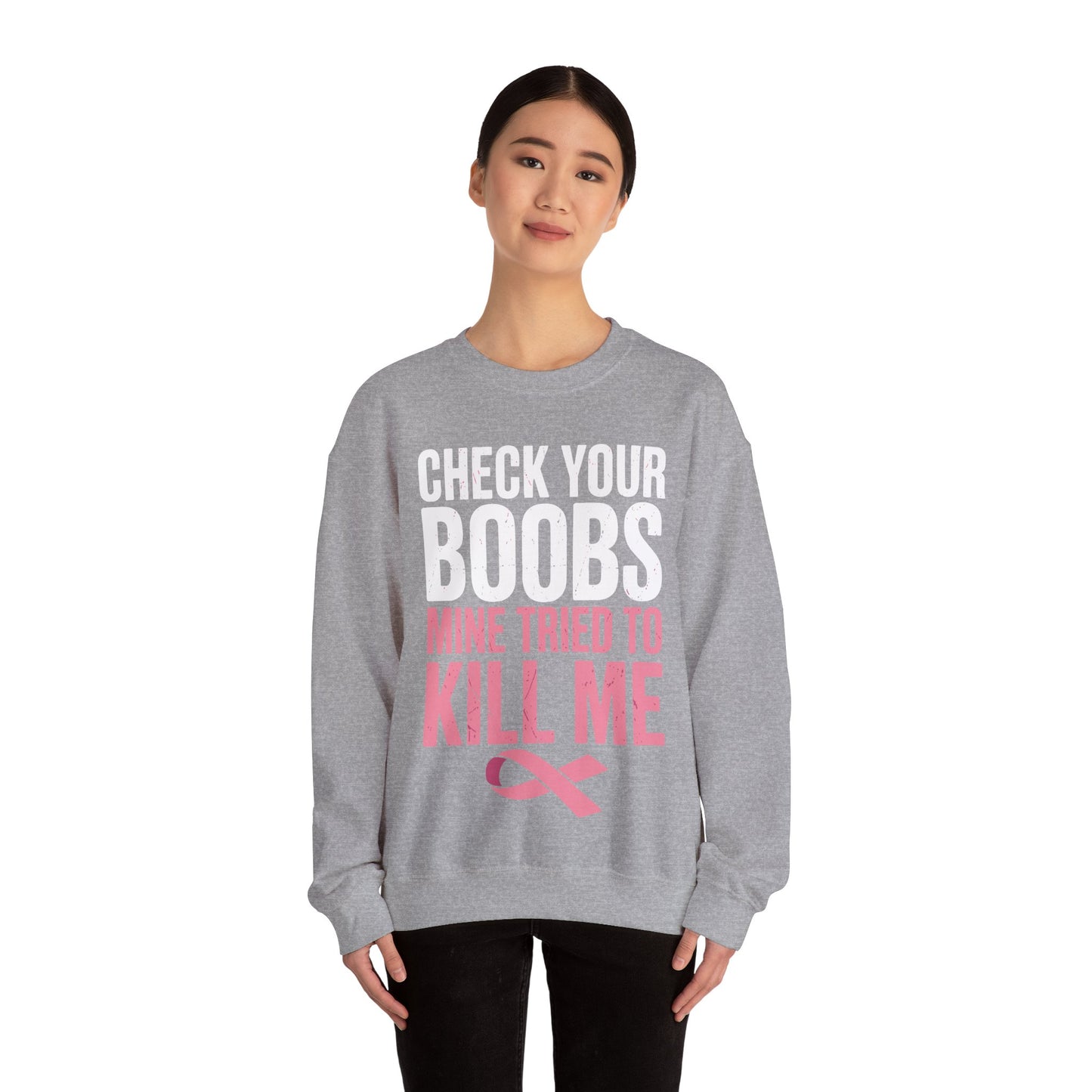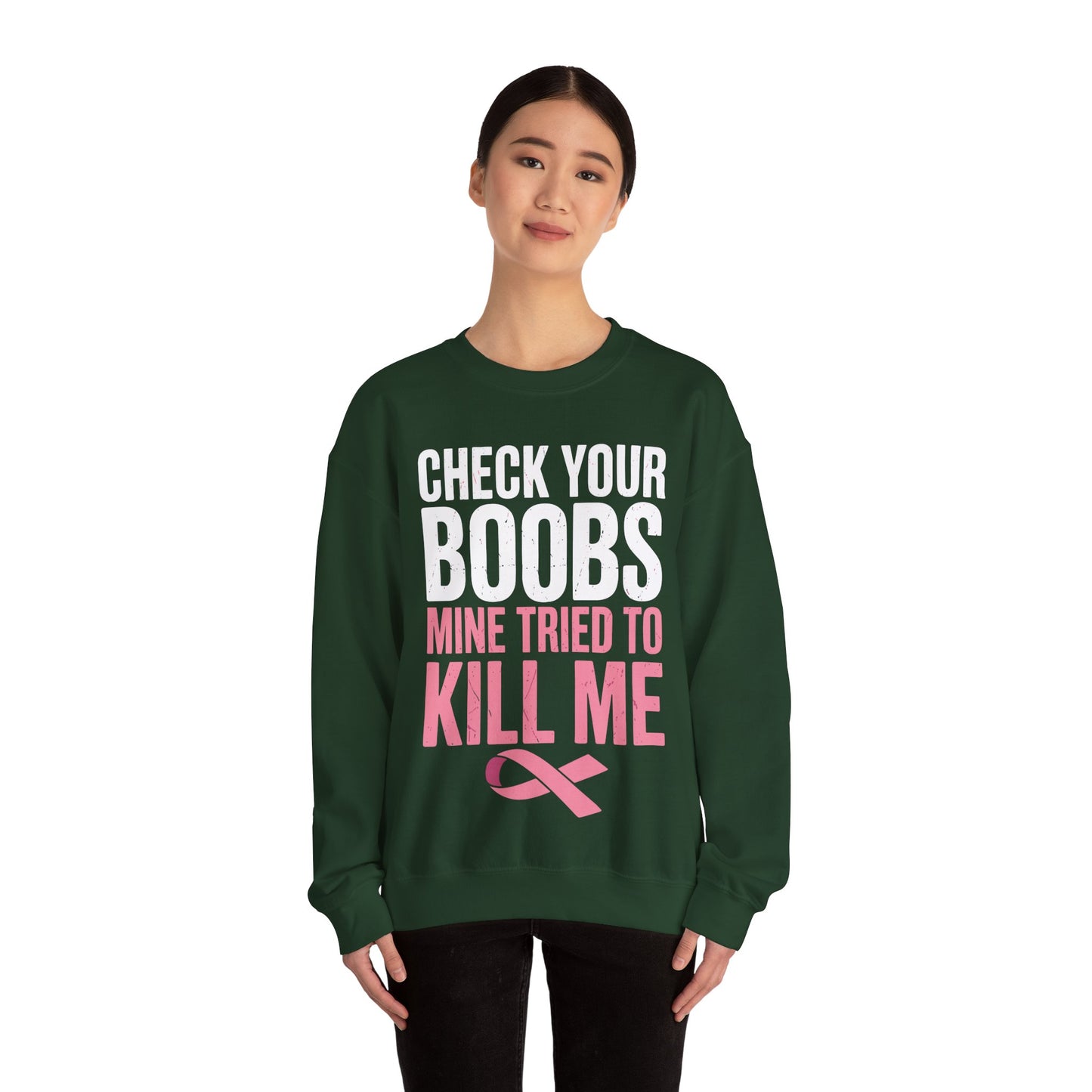 Check Your Boobs Mine Tried To Kill Me Funny Breast Cancer Sweatshirt