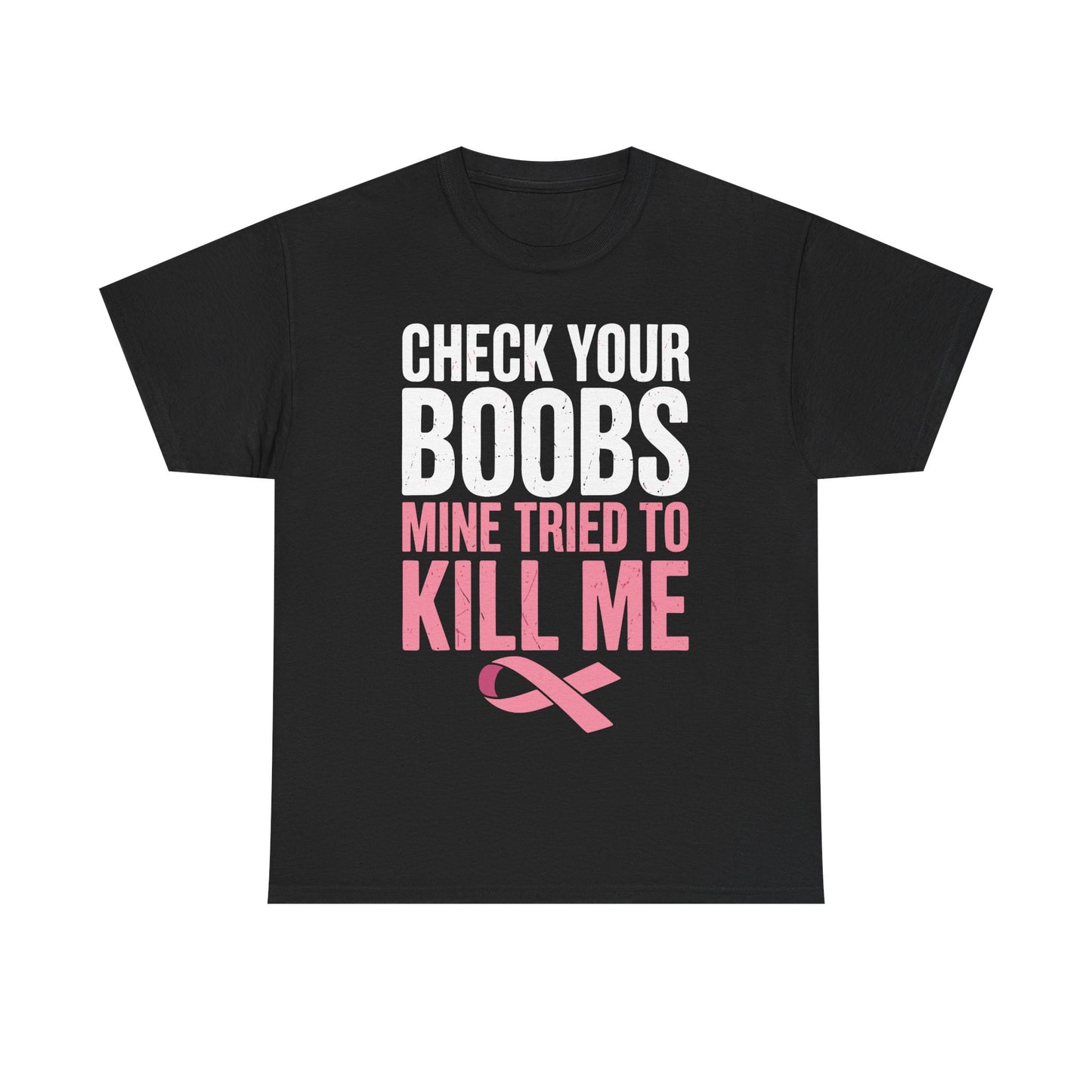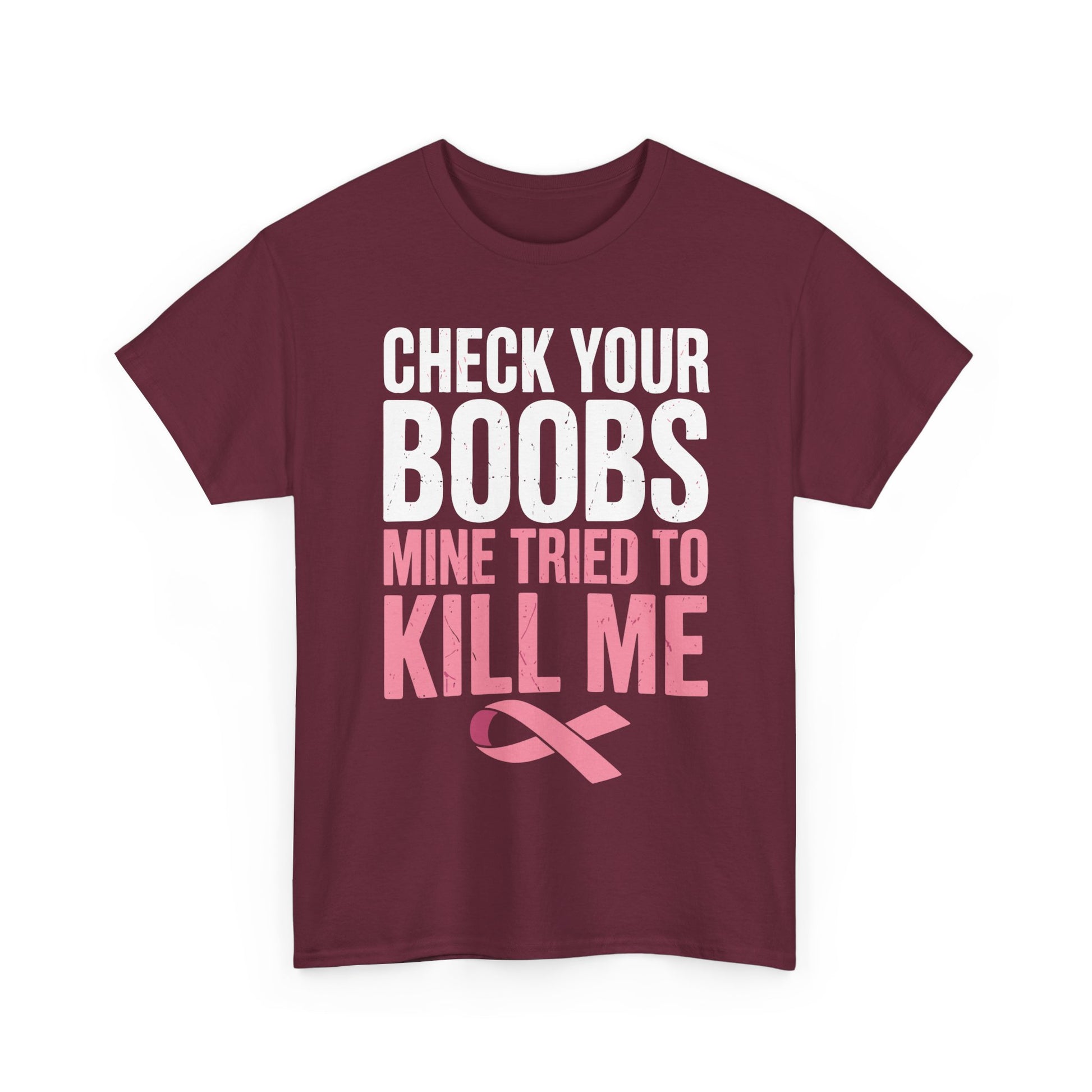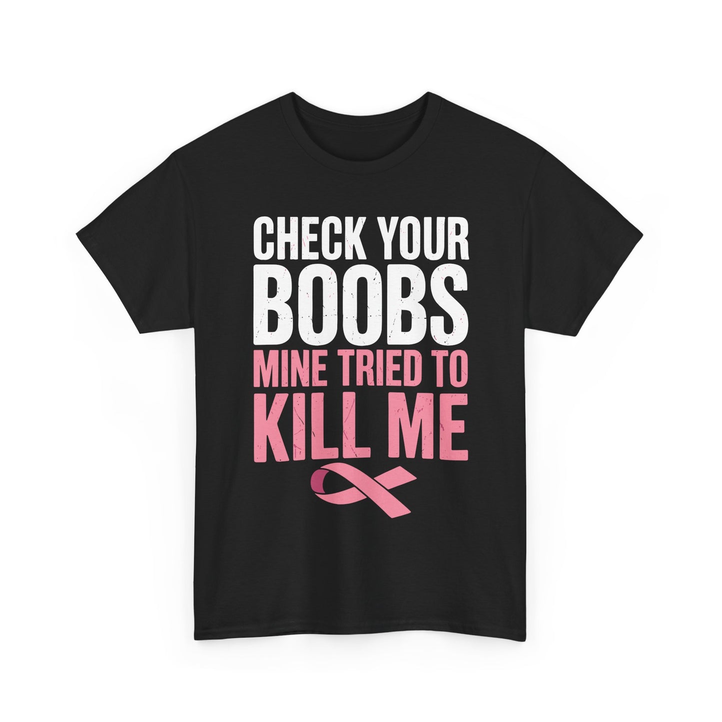 Check Your Boobs Mine Tried To Kill Me Funny Breast Cancer T-Shirt