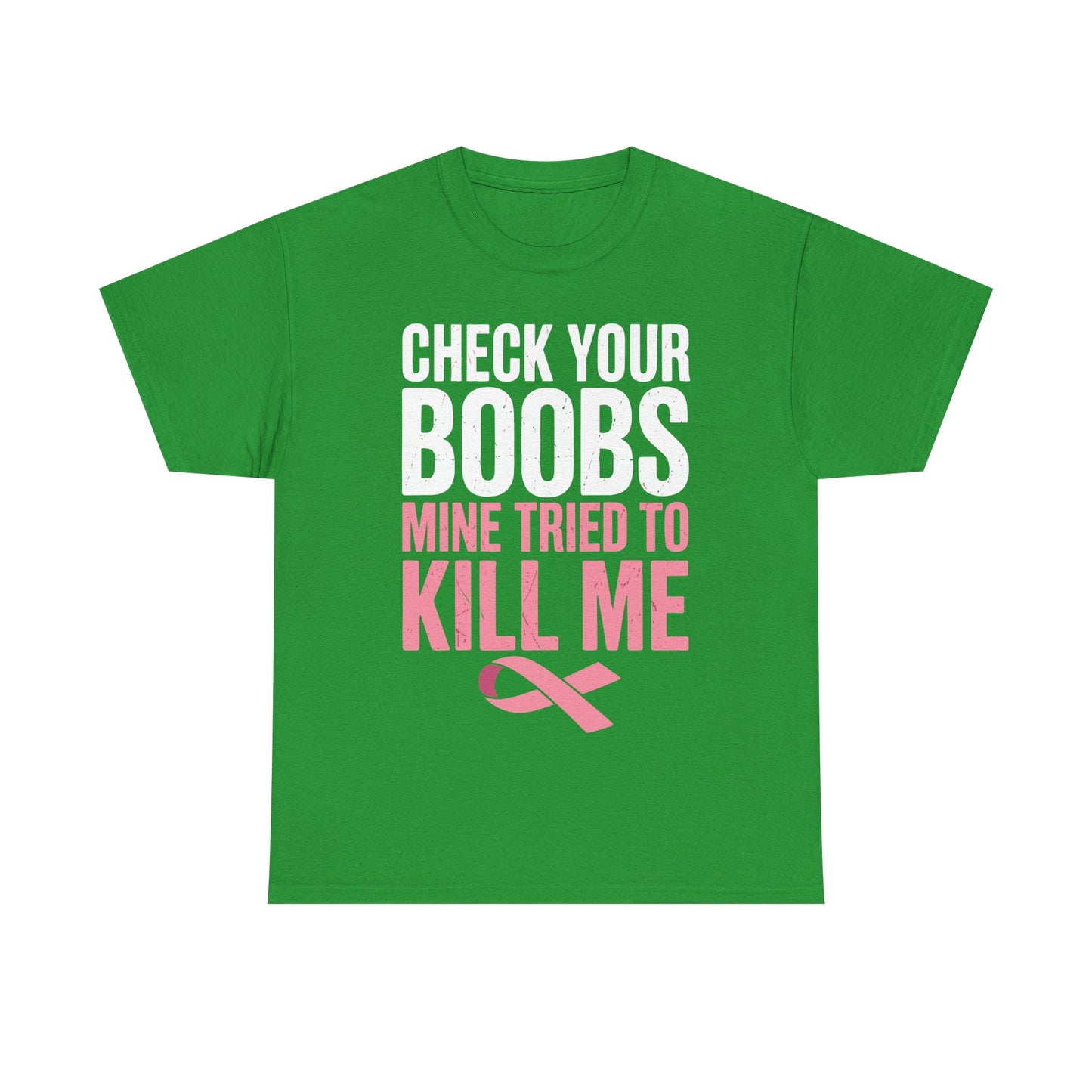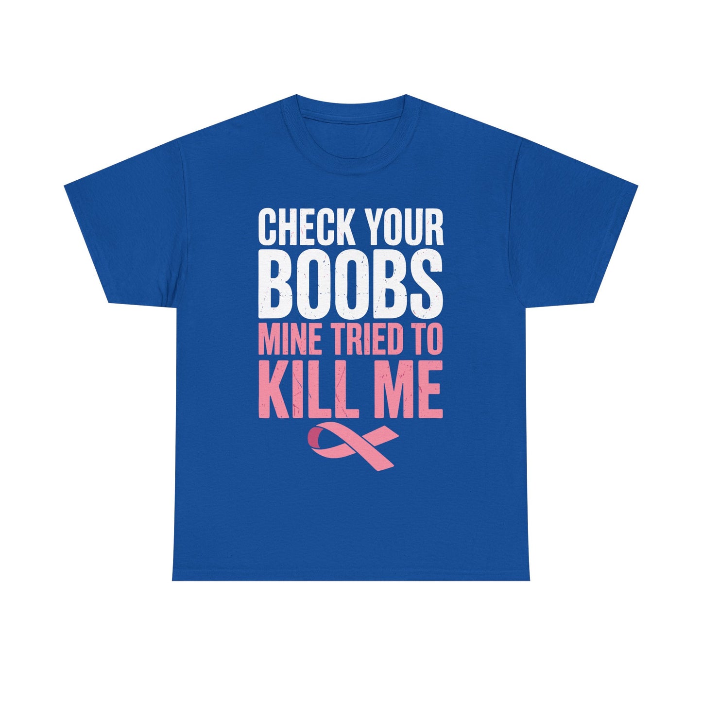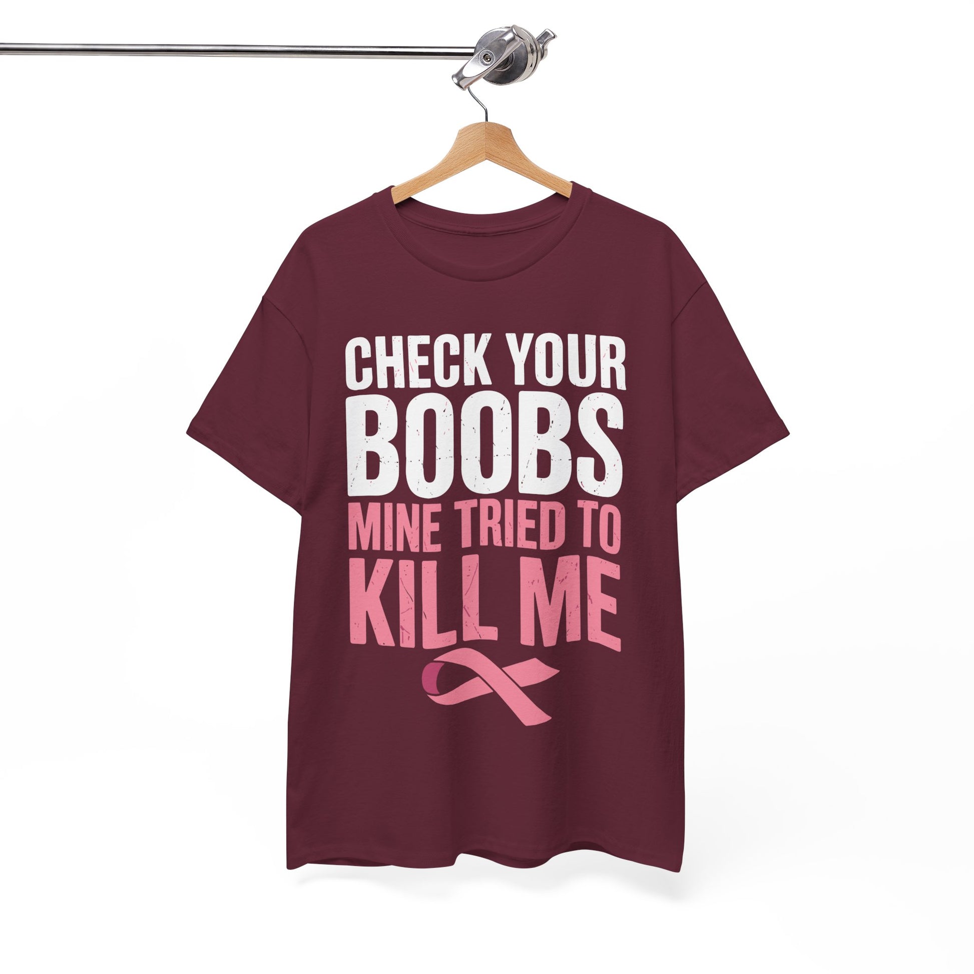 Check Your Boobs Mine Tried To Kill Me Funny Breast Cancer T-Shirt
