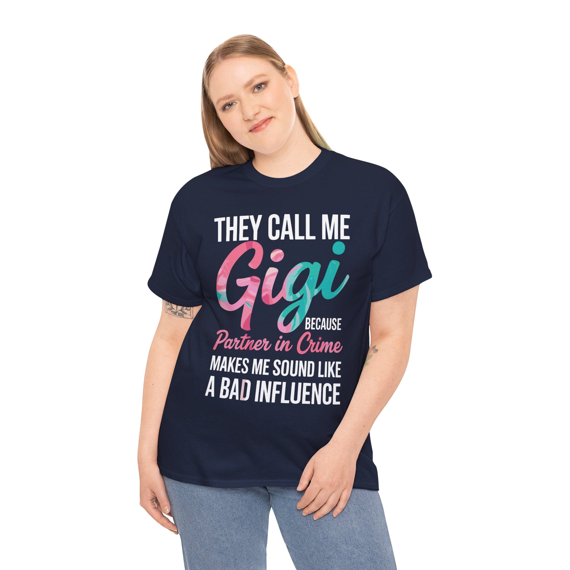 Witty “Partner in Crime” Graphic: Features the phrase “They Call Me Gigi Because Partner In Crime” in bold, playful lettering—perfect for grandmas with a mischievous streak.