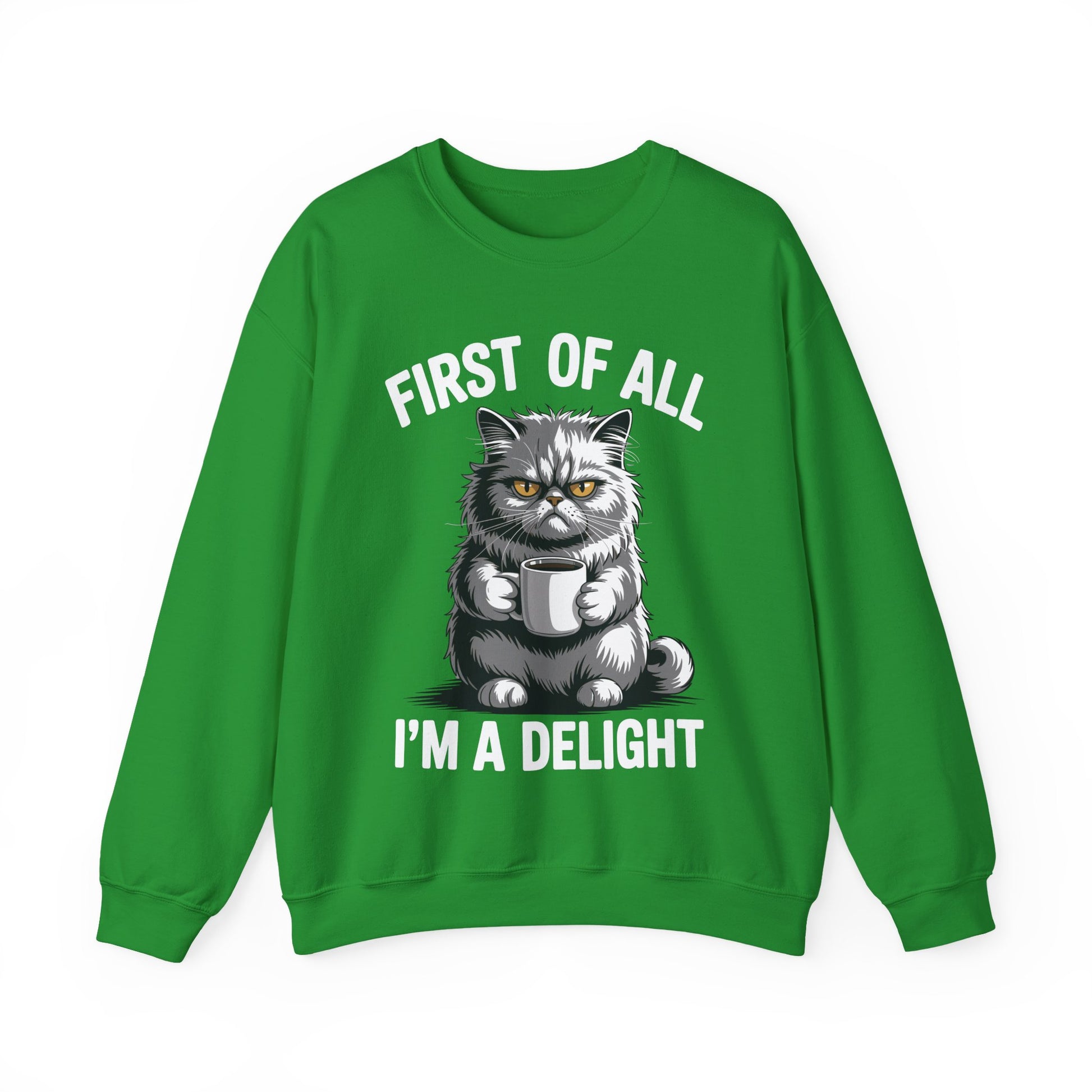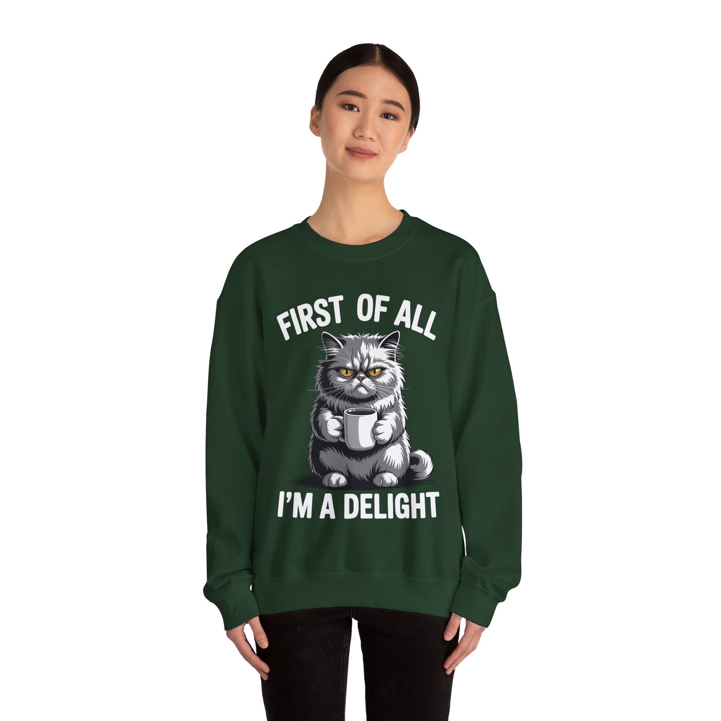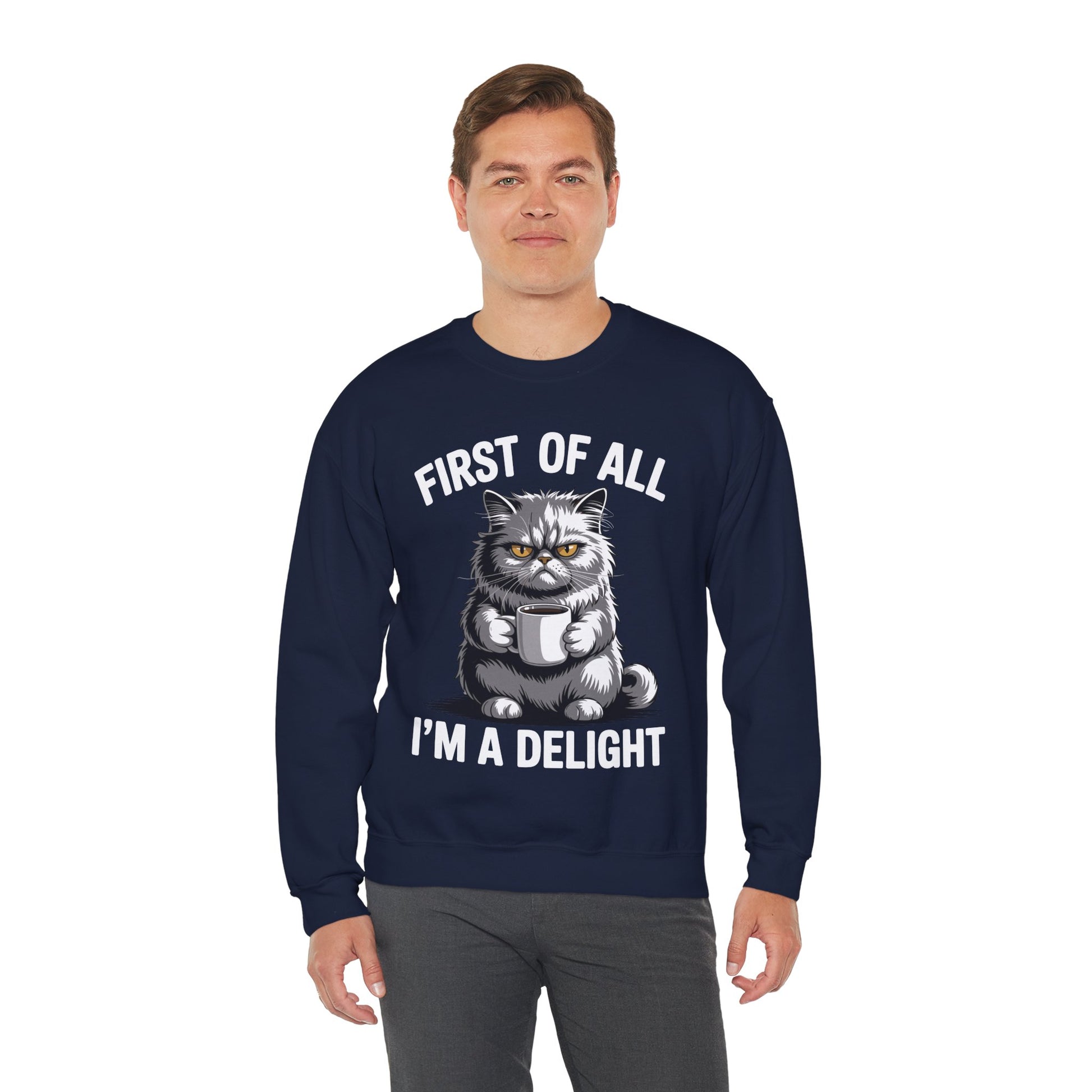 First Of All I'm A Delight Sarcastic Angry Cat Coffee Lover Sweatshirt for Men Women