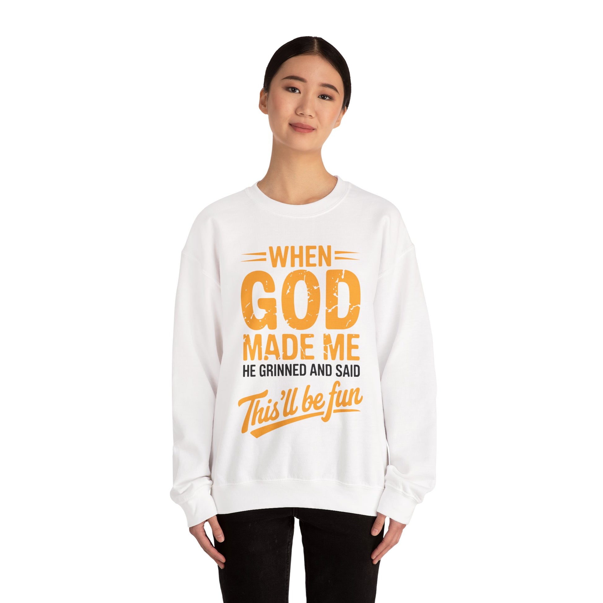 Ever feel like your personality was handcrafted for chaos, comedy, and a little divine mischief? This sweatshirt says what everyone’s been thinking: “When God made me, He said… this’ll be fun.” Whether you’re the class clown, the office jokester, or just someone who embraces their quirks, this sweatshirt is your badge of honor.