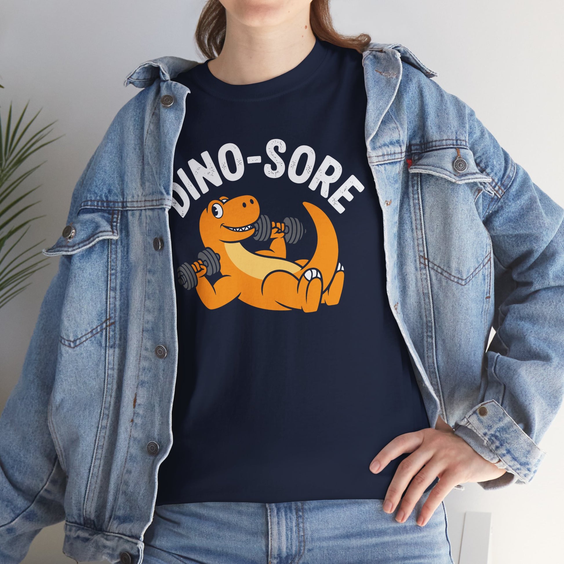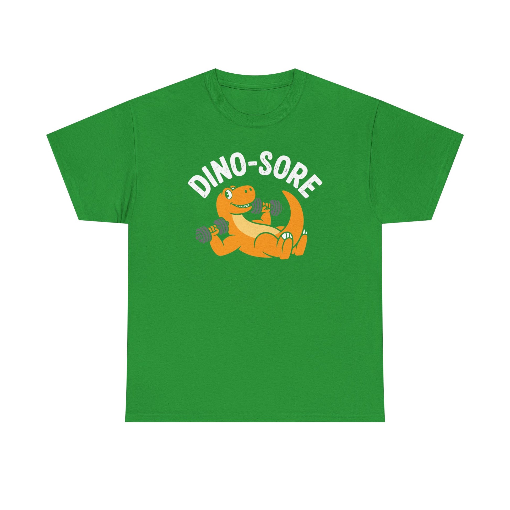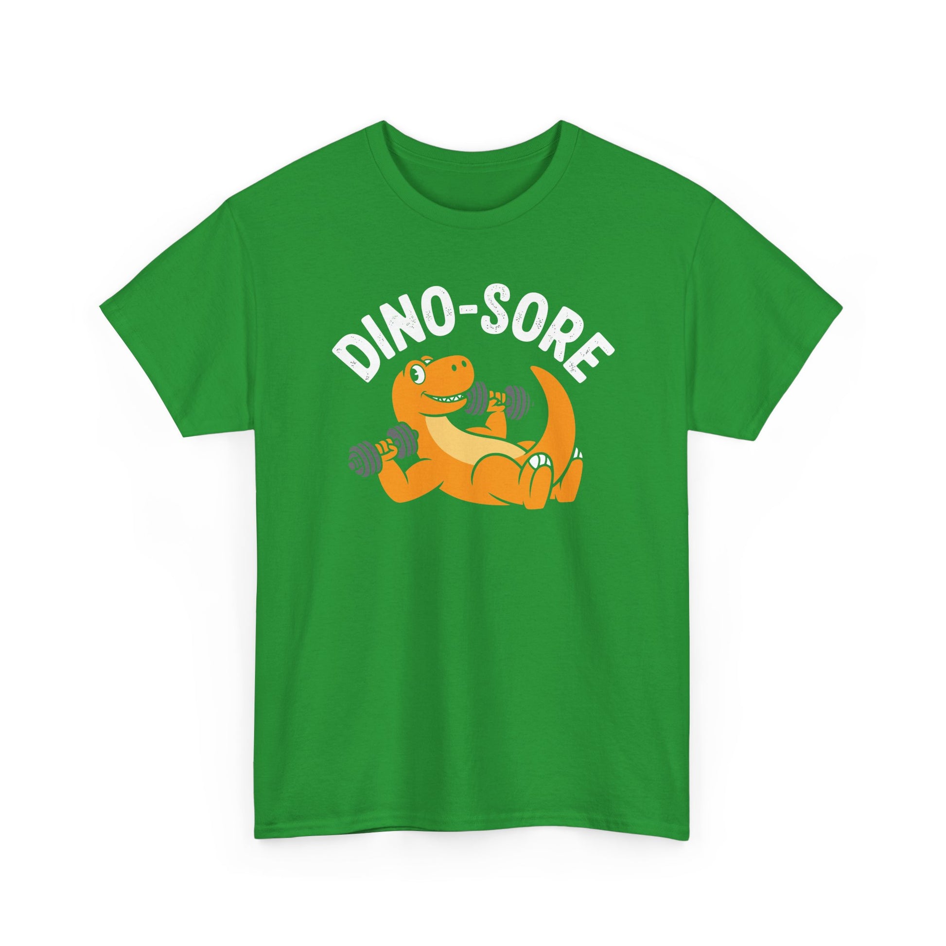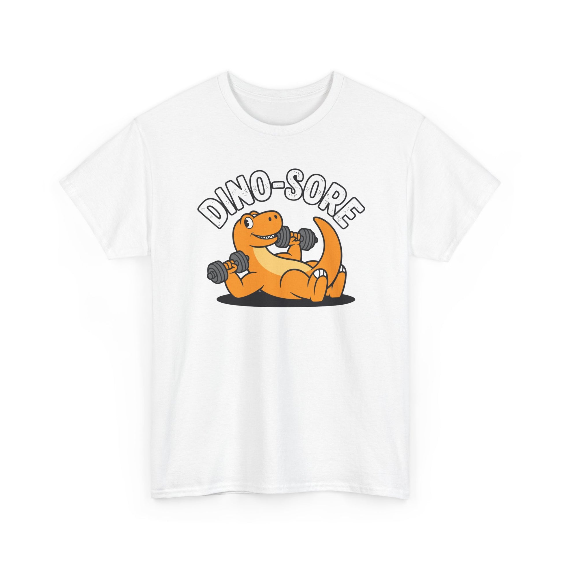 · Funny Dinosaur Graphic Design: Features a cartoon-style dino lifting weights with the pun “Dino Sore,” combining fitness humor with playful visuals