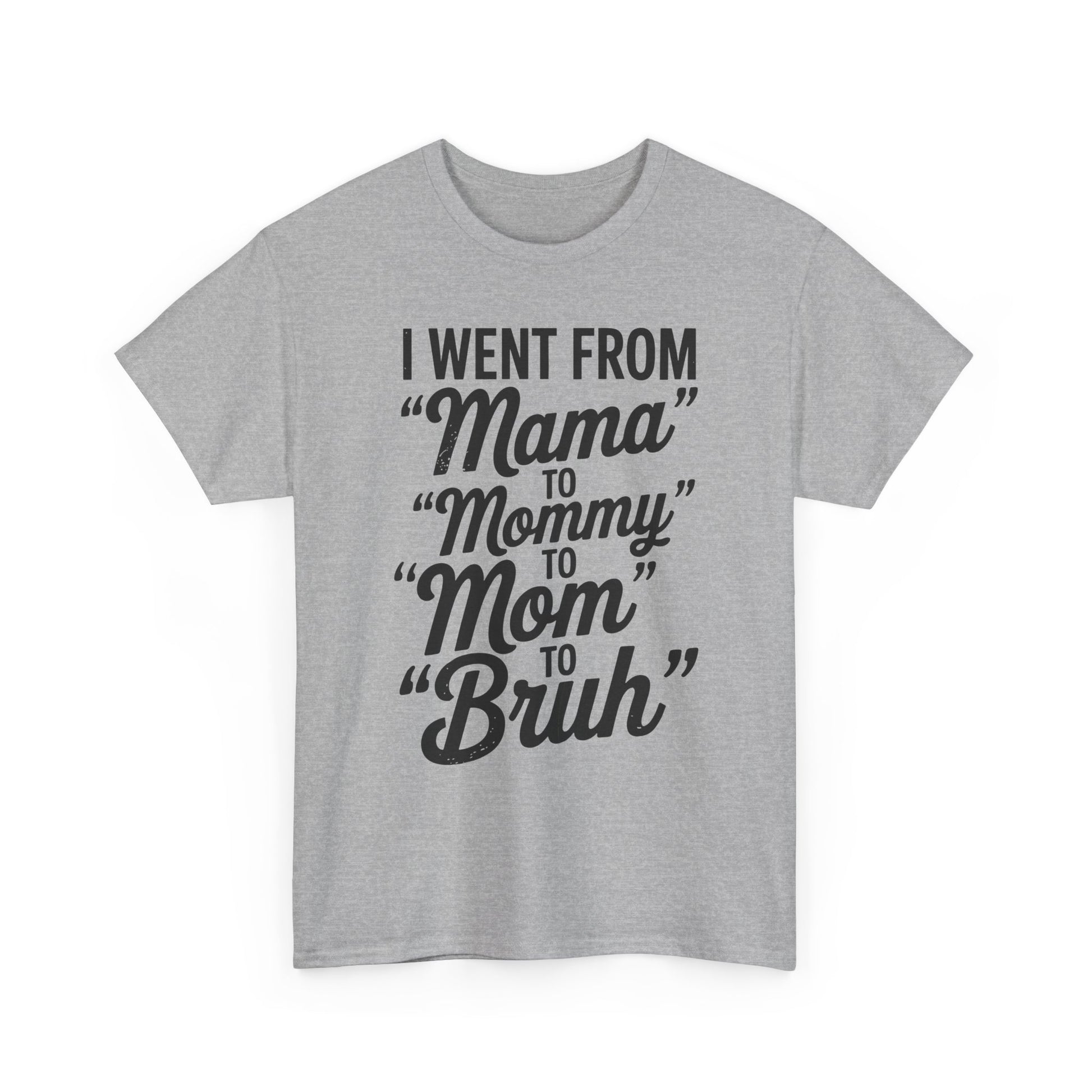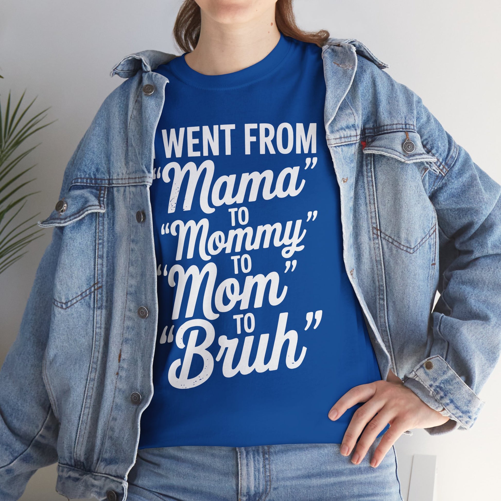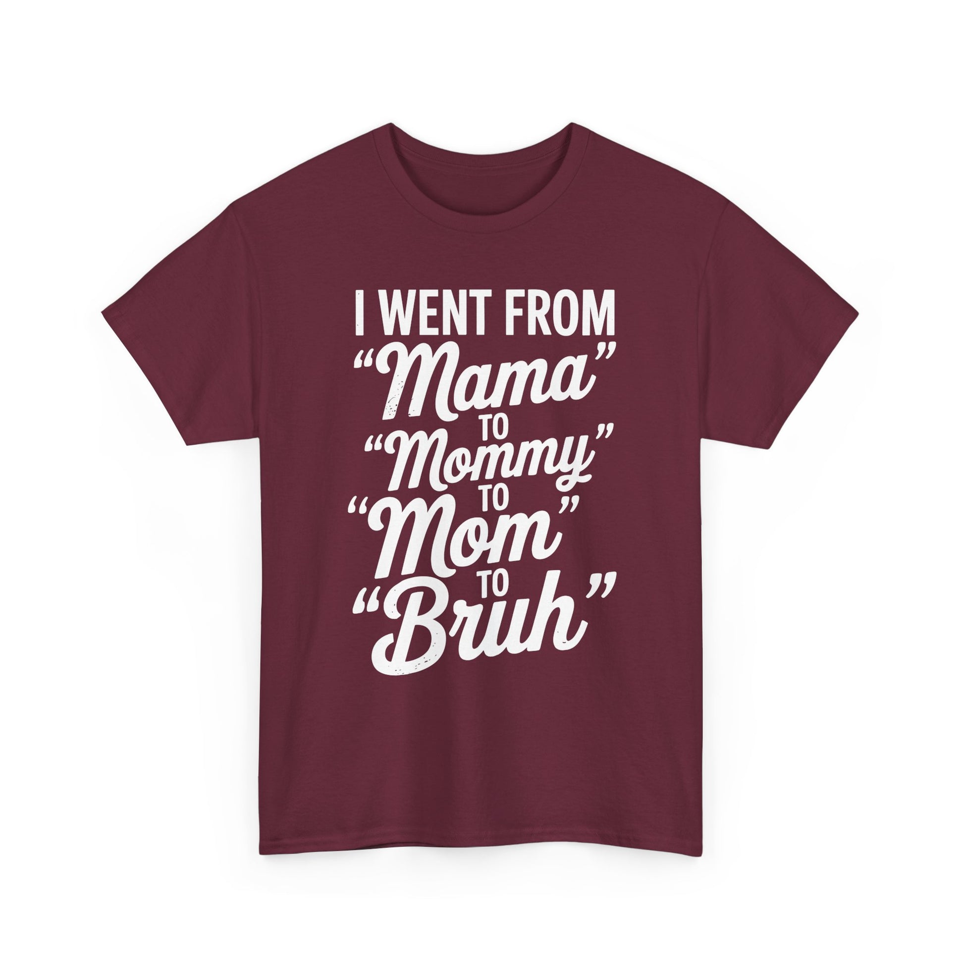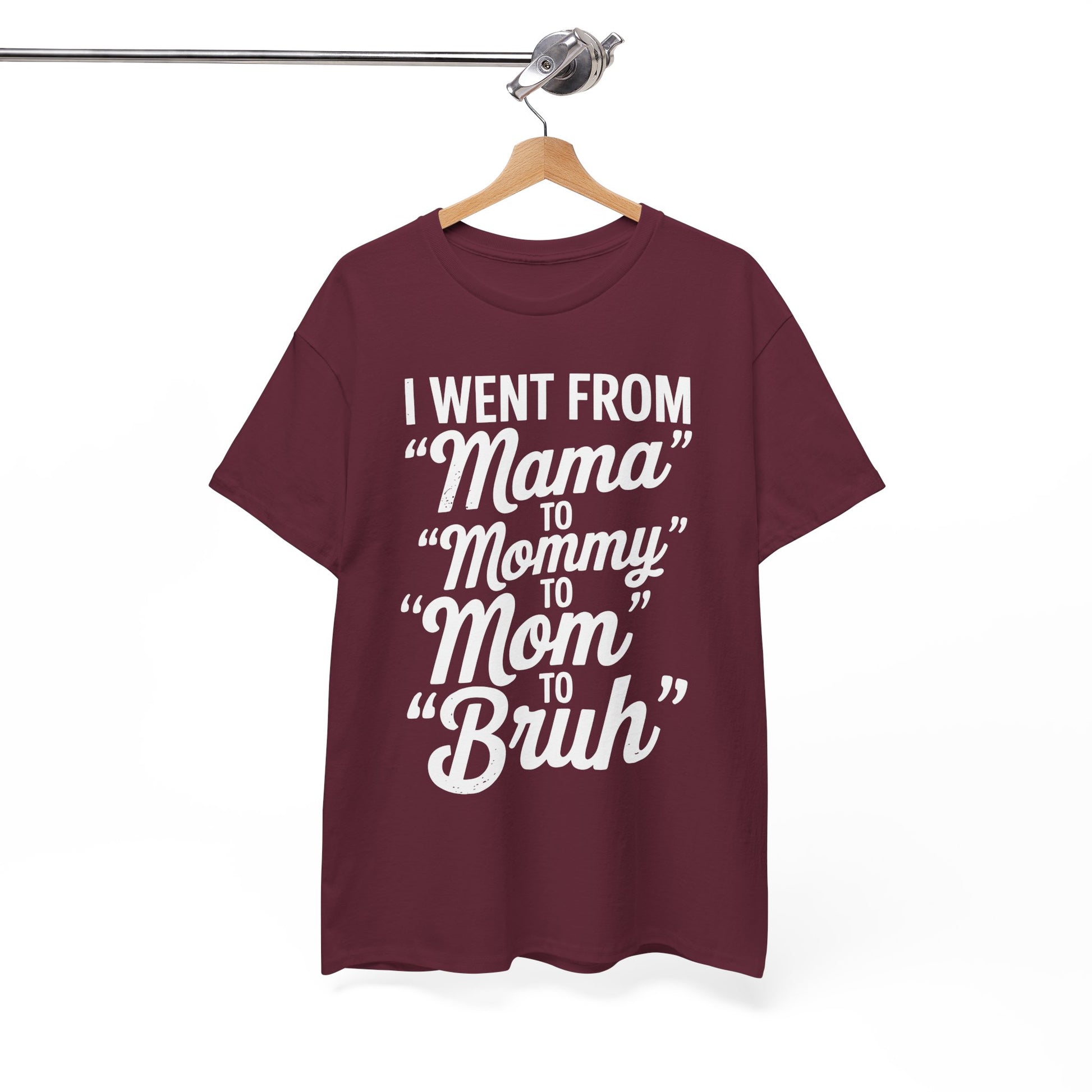 Sarcastic & Viral Design: Features the trending phrase “I Went From Mama to Mommy to Mom to Bruh” in bold, playful typography that gets laughs and nods.