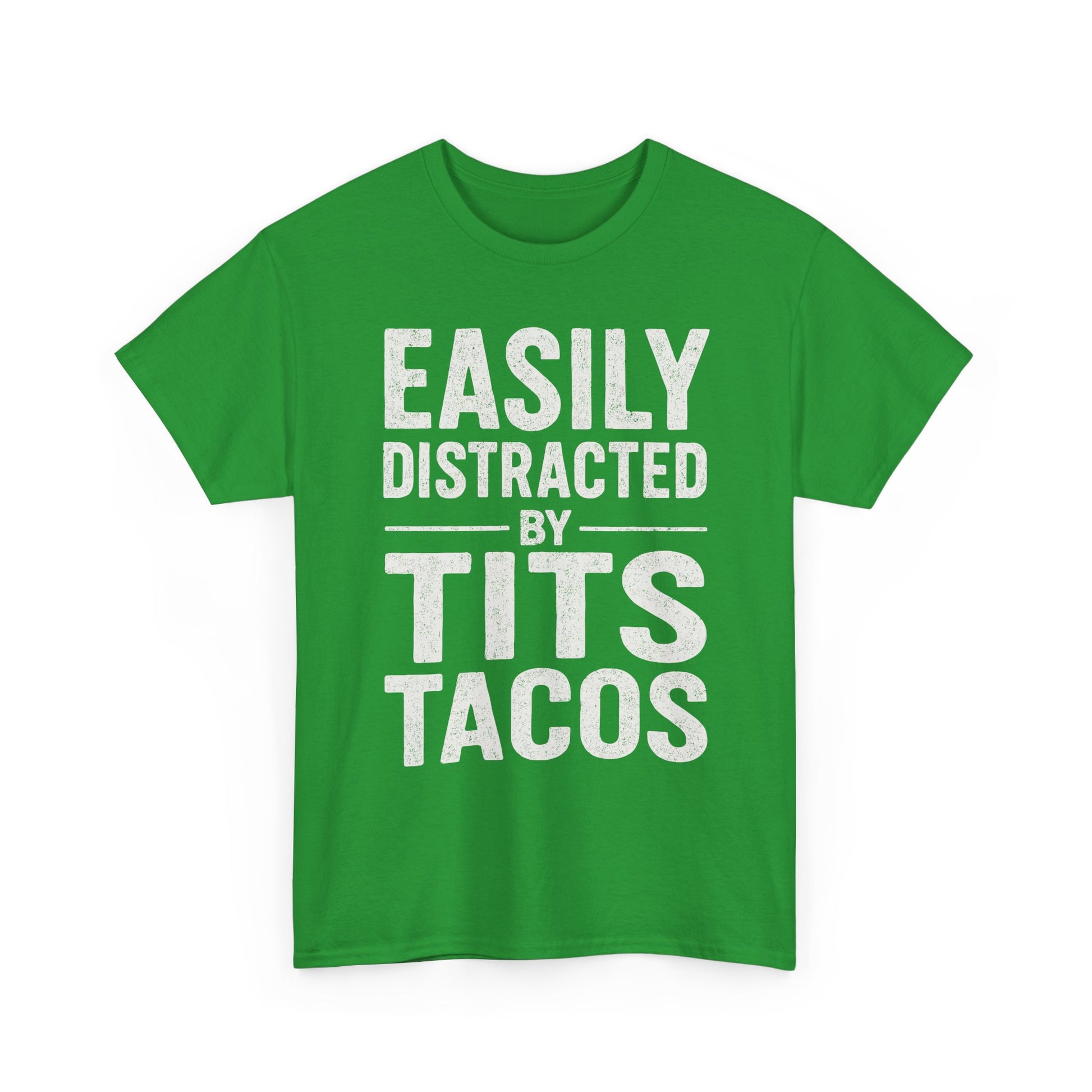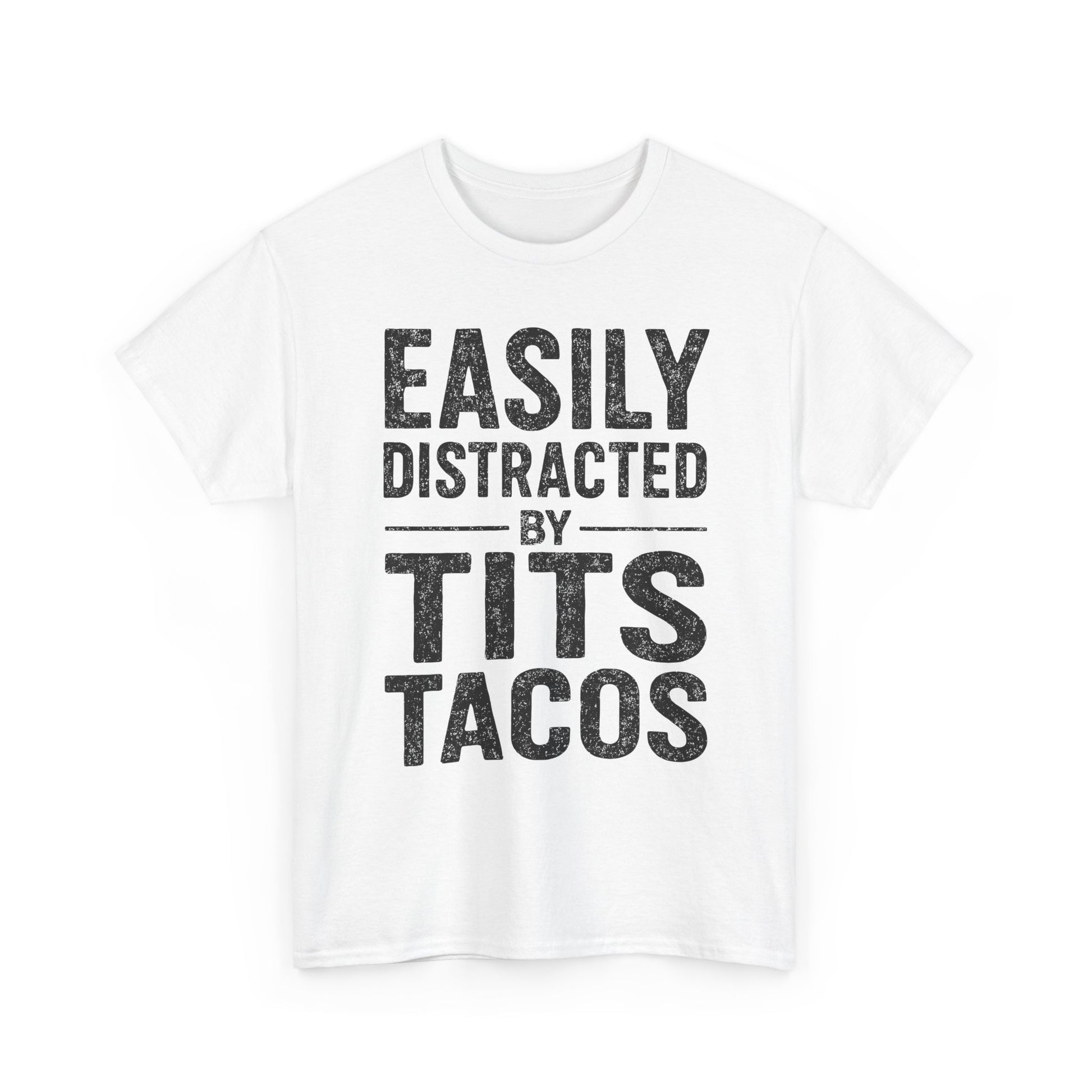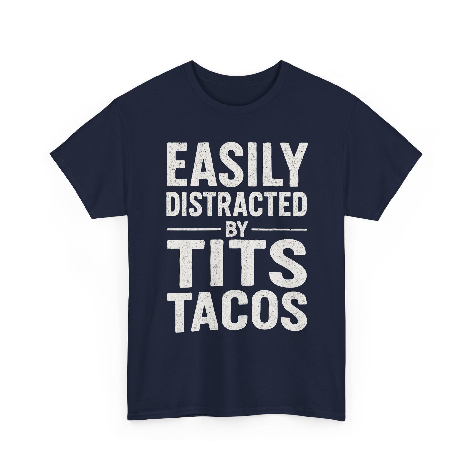 · Outrageously Funny Graphic Design: Features the phrase “Easily Distracted By Tits and Tacos” in bold, eye-catching text—guaranteed to spark laughs and double-takes wherever you go.
