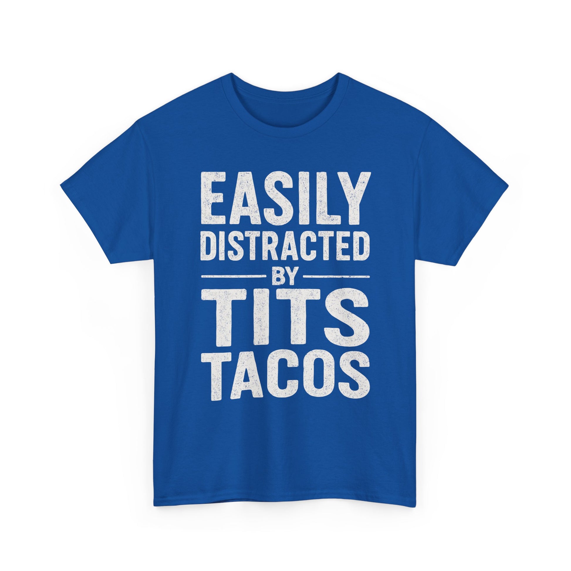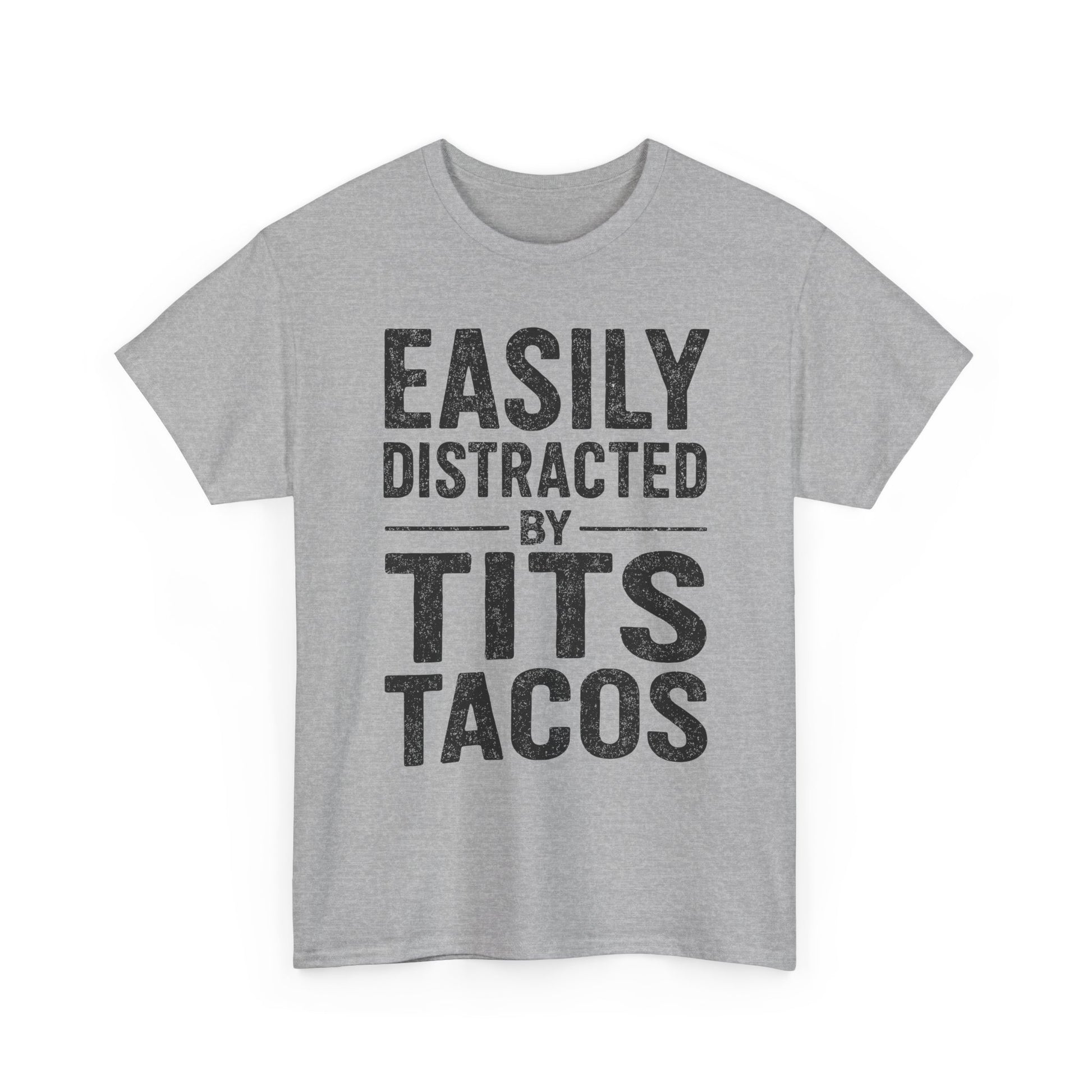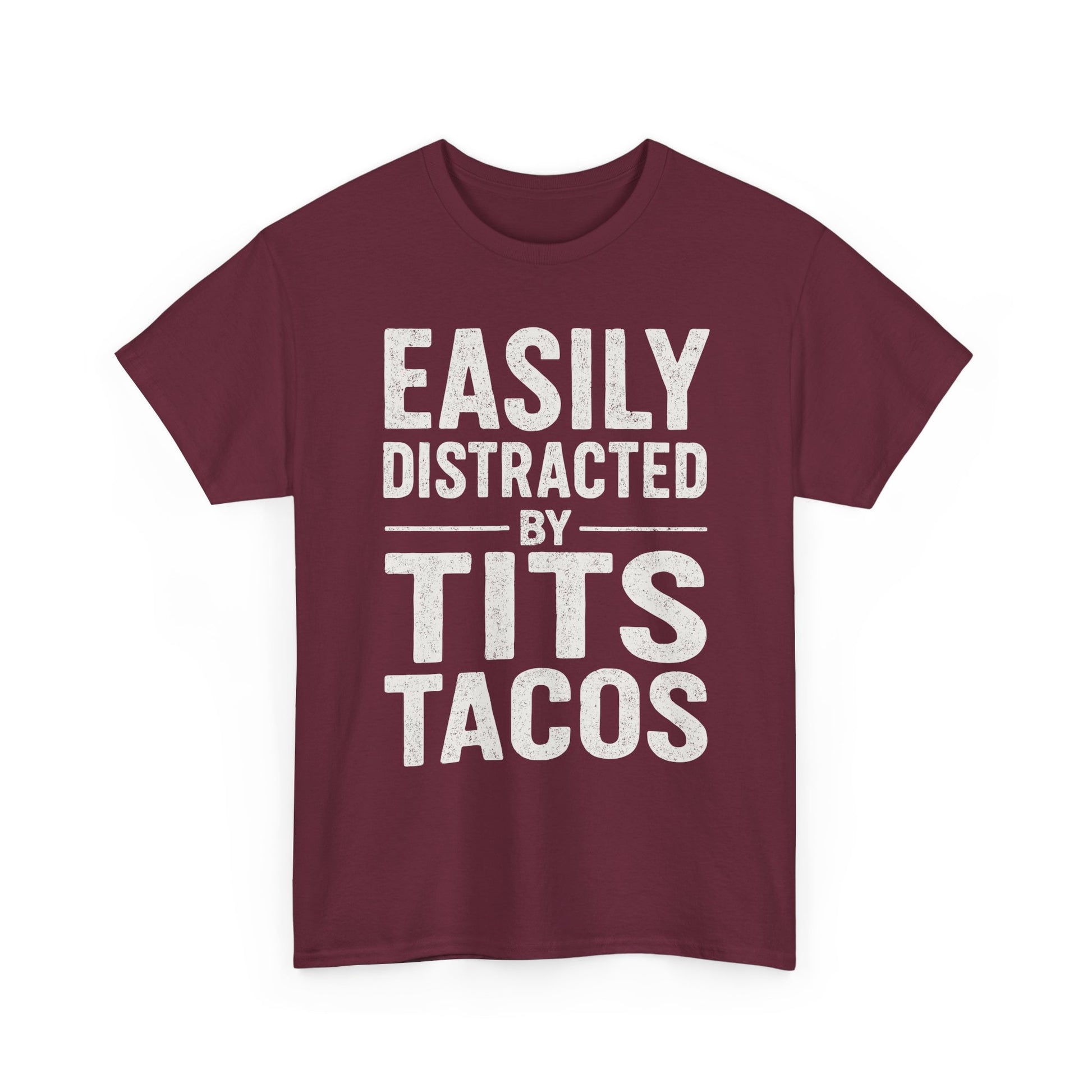 · Outrageously Funny Graphic Design: Features the phrase “Easily Distracted By Tits and Tacos” in bold, eye-catching text—guaranteed to spark laughs and double-takes wherever you go.