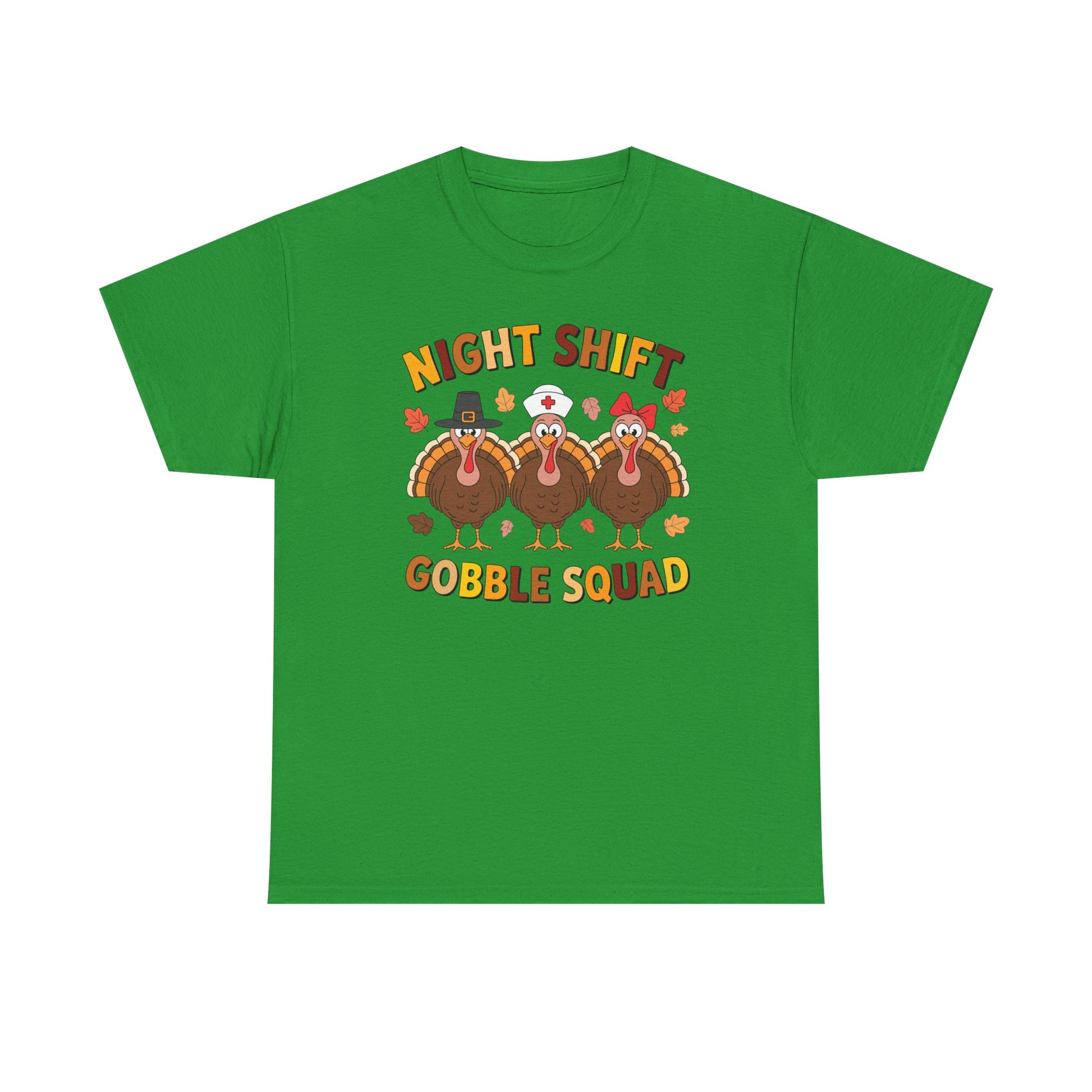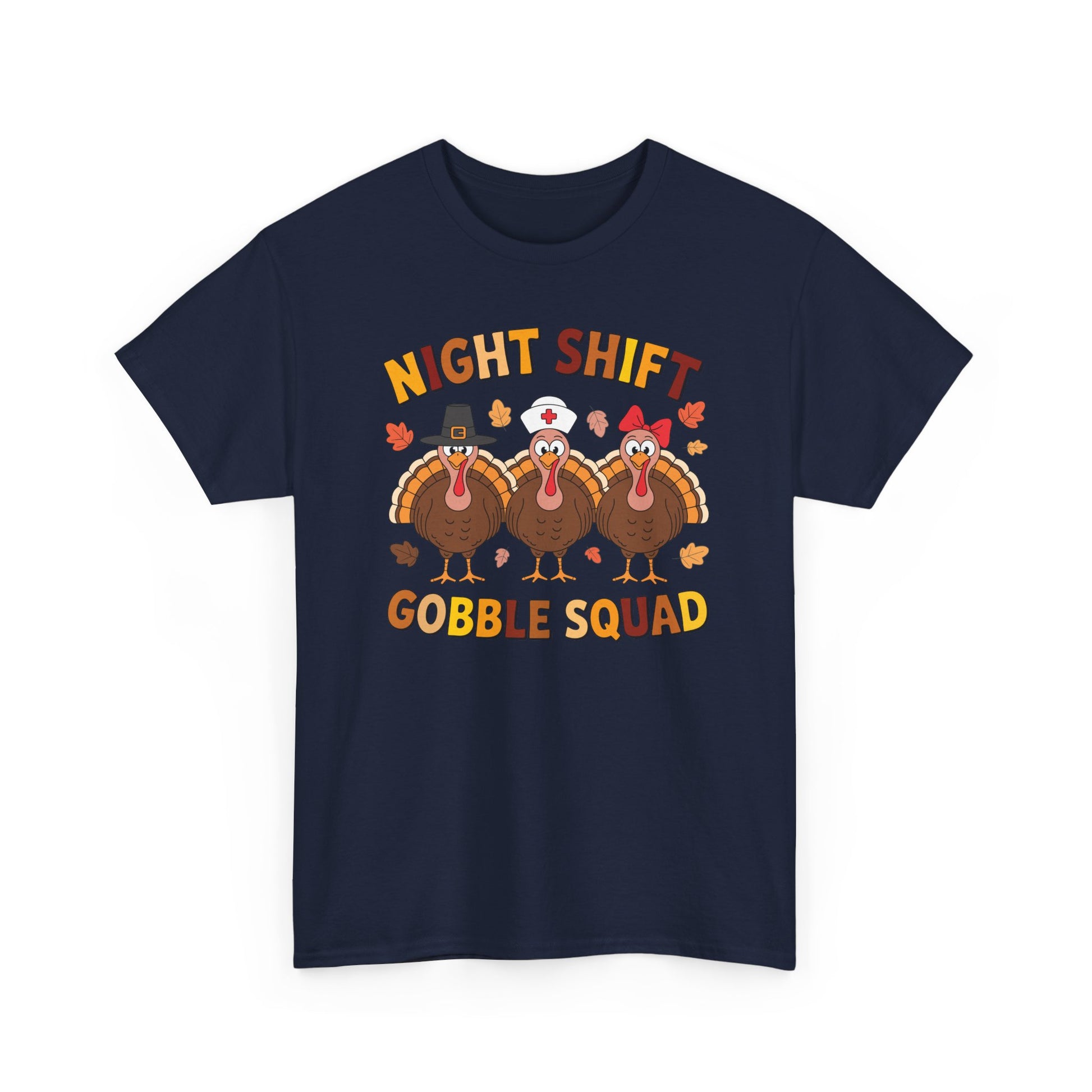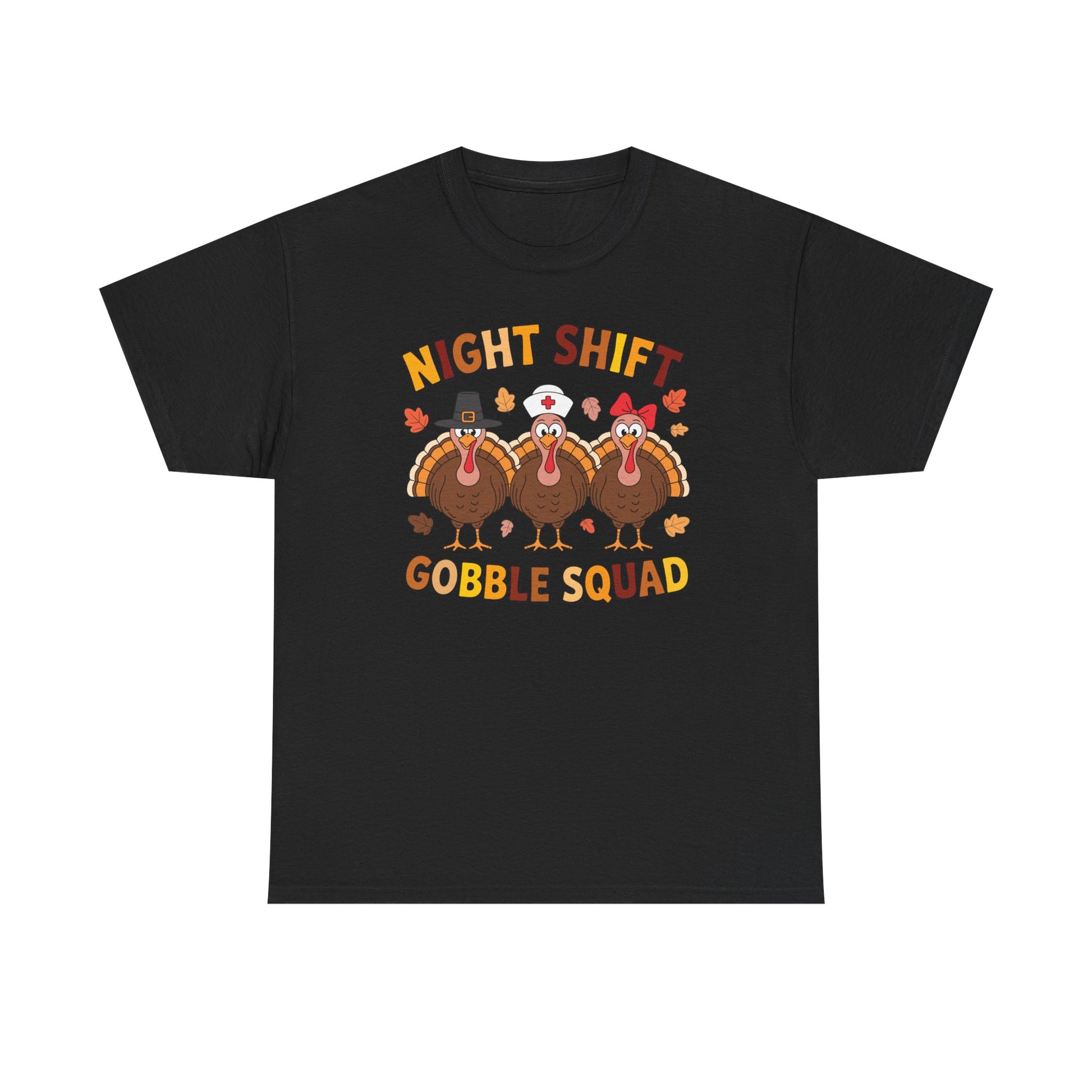 · Gobble Squad Graphic: Features a fun turkey-themed design that celebrates night shift workers—perfect for staff who want to show pride and humor
