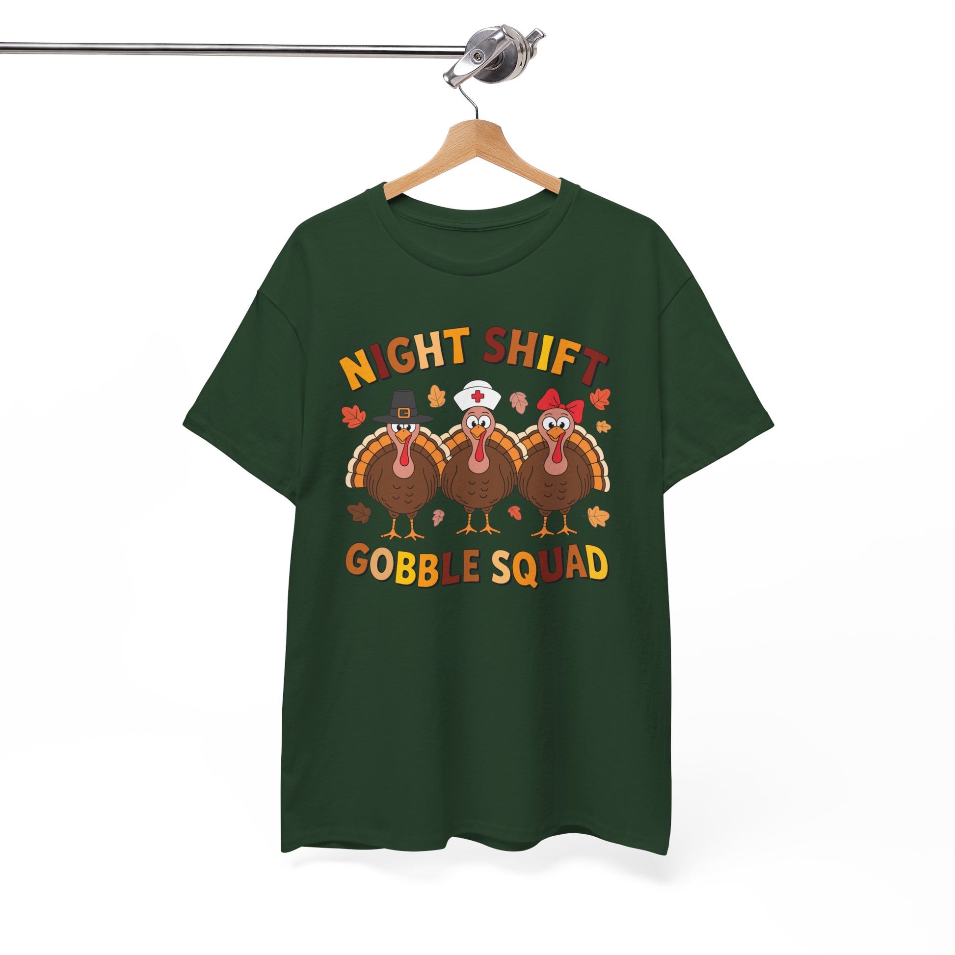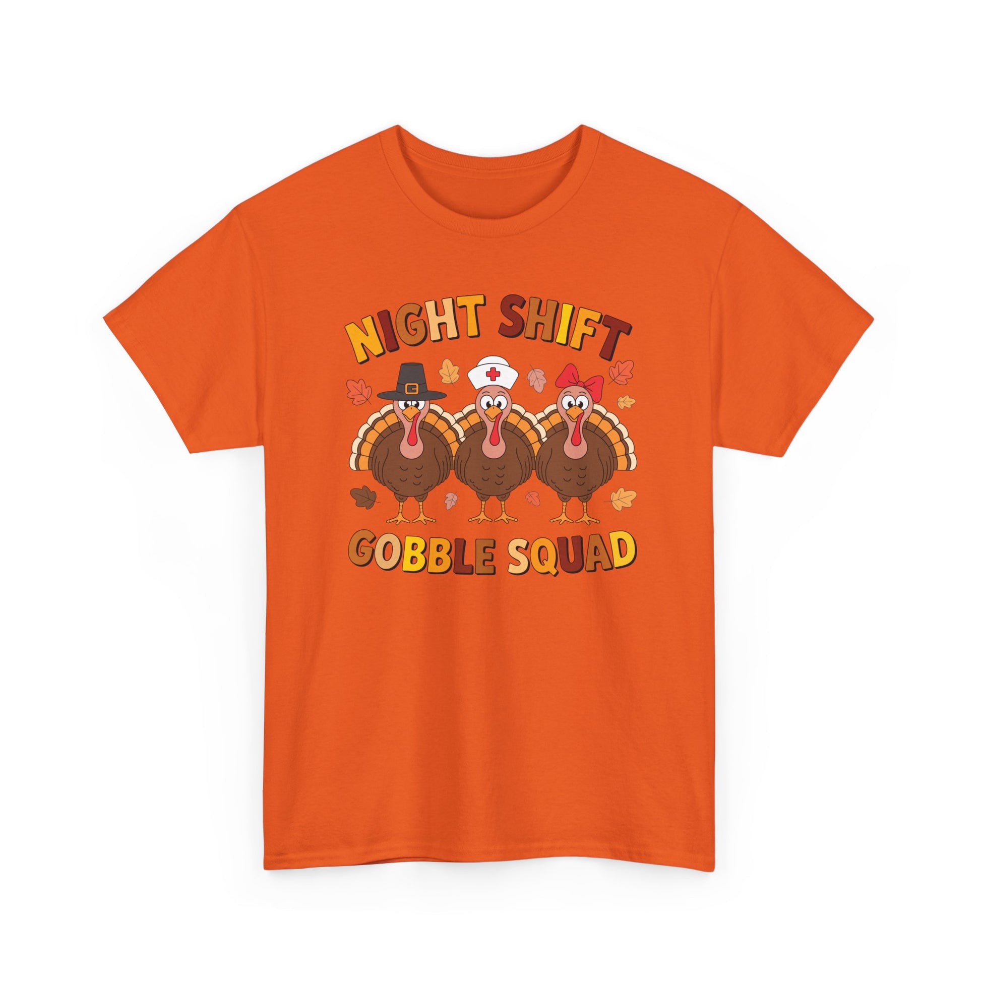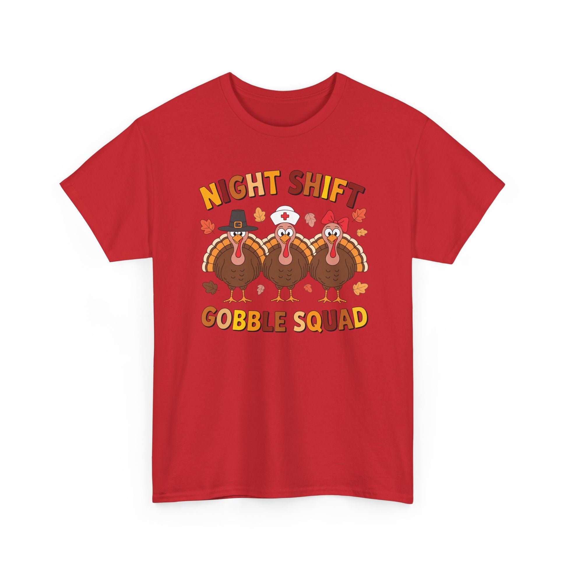 · Gobble Squad Graphic: Features a fun turkey-themed design that celebrates night shift workers—perfect for staff who want to show pride and humor
